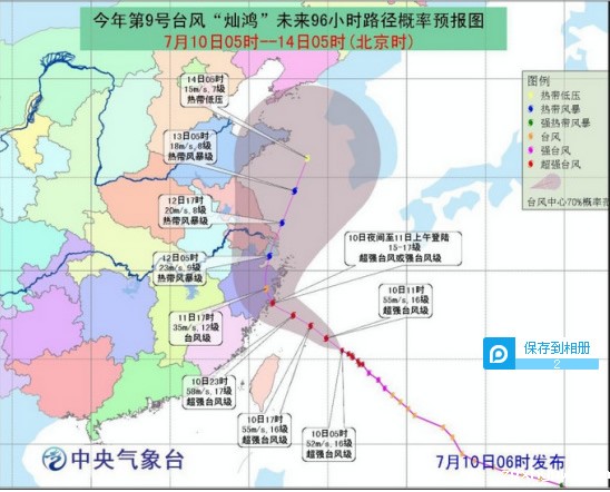 浙江省气象台7月10日凌晨6点30分发布最新台风警报称,第9号台风“灿鸿”(超强台风)10日05时位于温州东南偏东约580公里东海海面上,就是北纬25.5度、东经125.9度,中心气压935hPa,近中心最大风力16级(52m/s)。台风“灿鸿”过去12小时向西北方向移动了约300公里。预计“灿鸿”将以每小时20公里左右速度向西北方向移动,然后逐渐向浙江沿海靠近,将于10日后半夜到11日中午在瑞安到舟山一带沿海登陆,登陆时超强台风能高达17级。