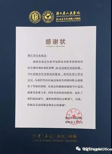 2020年3月2日,zgxhypw定向向浙江省人民医院捐赠了一批抗“疫”专用物资,这批物资包括医用口罩1万只、84消毒液960瓶、75%酒精1150瓶。浙江省人民医院副院长张雅萍、童向民代表医院接受了捐赠,并向商会发来了感谢信和感谢状,我会秘书长范海亮,常务副会长秦承利,副会长李桂英、王强和党委副书记刘续强,办公室屠益祥参加了活动。