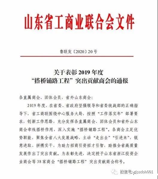 2020年5月19日,山东省工商联下发了关于表彰2019 年度“搭桥铺路工程”突出贡献商会的通报,我商会名列其中。2019年度,在山东省委省政府号召下、在山东省工商联指导下,我商会充分发挥桥梁纽带作用,利用商会网站和微信公众号平台,全面宣传推介山东各地招商引资的优惠政策。2019年度,我商会先后组织会员企业“聊城行”、“沂蒙行”、“德州行”、“泰安行”,返回山东实地考察投资;并协助济宁、临沂、菏泽、淄博等地市县在杭州举办大型招商推介活动,组织会员企业反哺家乡,在山东投资金额已超300亿元。我商会立足“服务为本(服务会员、服务家乡政府招商引资工作)、重商为先”的办会宗旨,主动“走出去”“引进来”,锐意进取、拼搏实干,为助力招商引资招才引智,助推全省高质量发展作出了应有的贡献。为此,山东省工商联为表彰先进,决定授予zgxhypw等19家省商会“搭桥铺路工程”突出贡献商会称号。