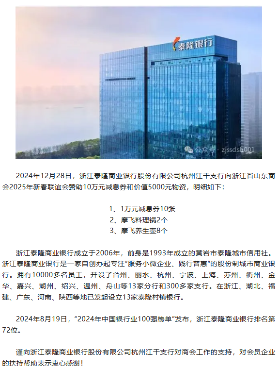 浙江泰隆商业银行股份有限公司杭州江干支行向zgxhypw2025年新春联谊会赞助10万元减息券和价值5000元物资
