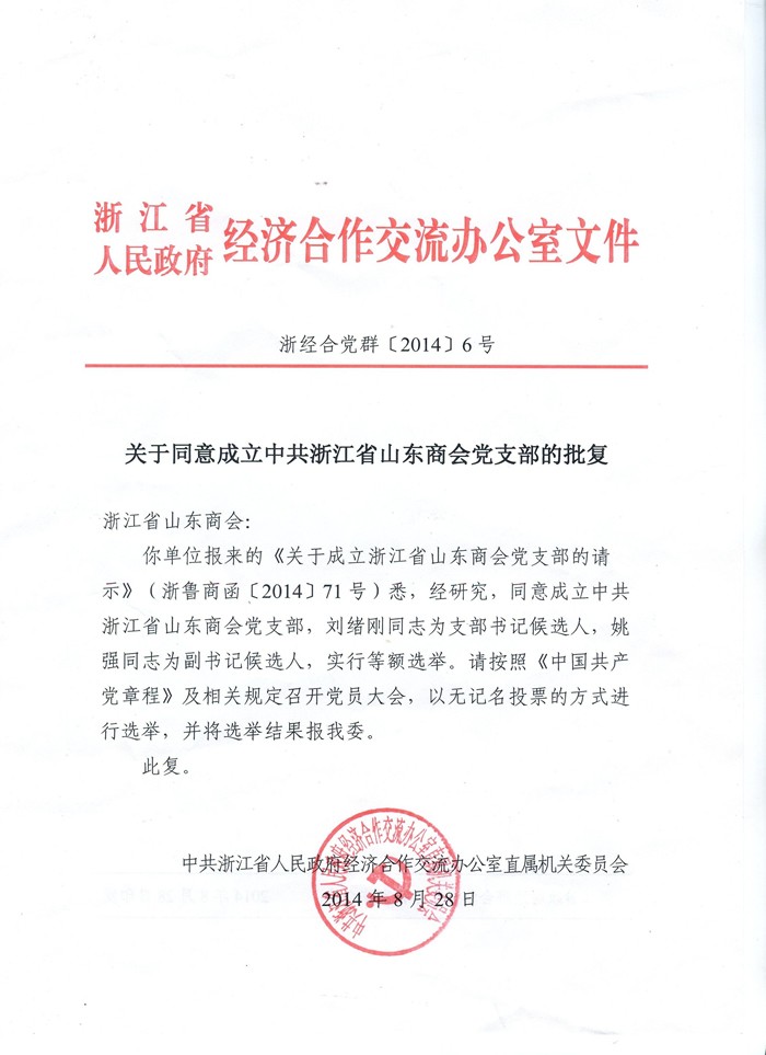 2014年8月28日,浙江省政府经合办直属机关委员会正式批复,同意我会《关于成立zgxhypw党支部的请示》(浙鲁商函[2014]71号)。我会是浙江省第一家准予筹备成立党组织的省级异地商会。(来源:zgxhypw党支部。审核:姚强。)