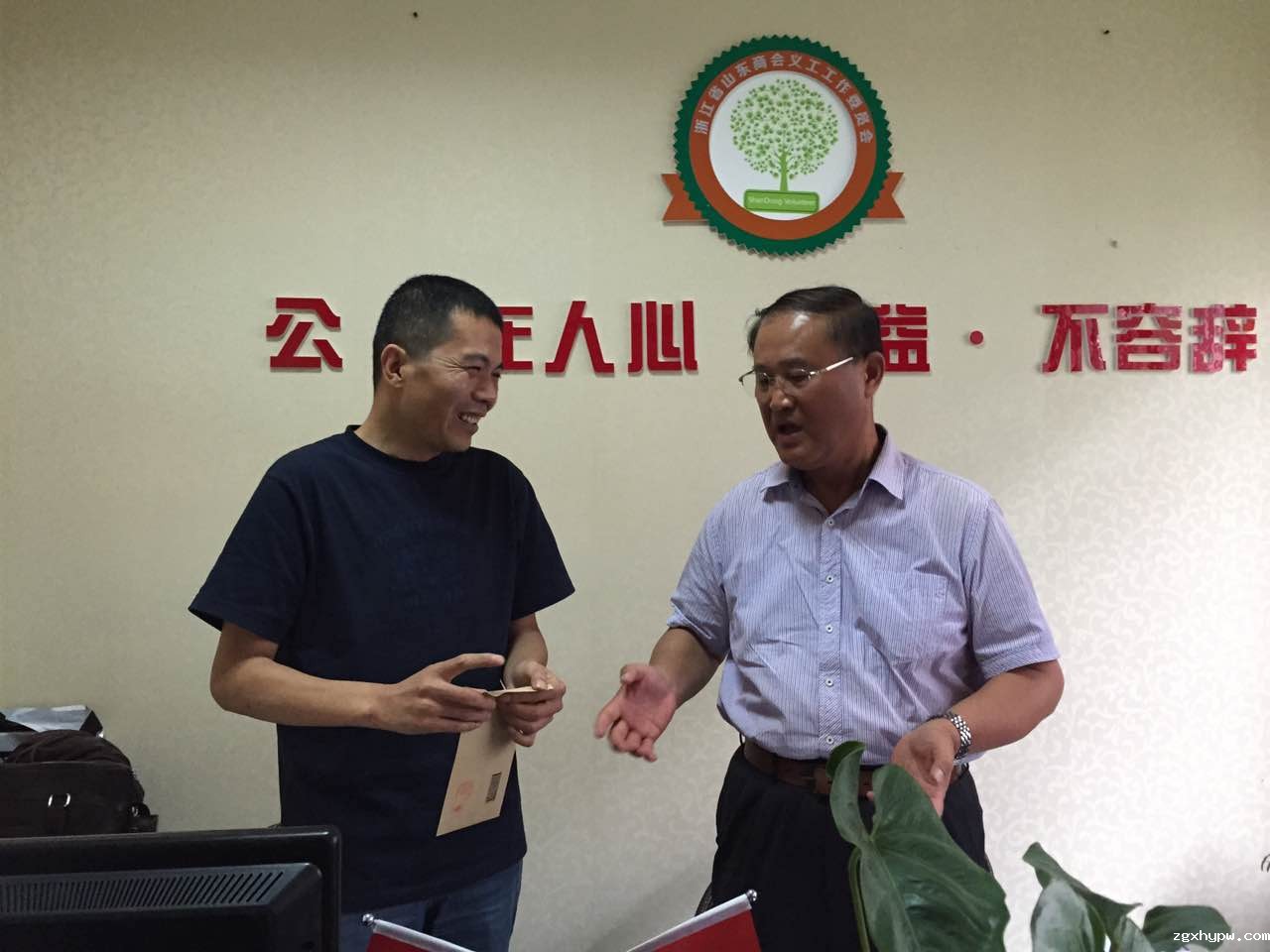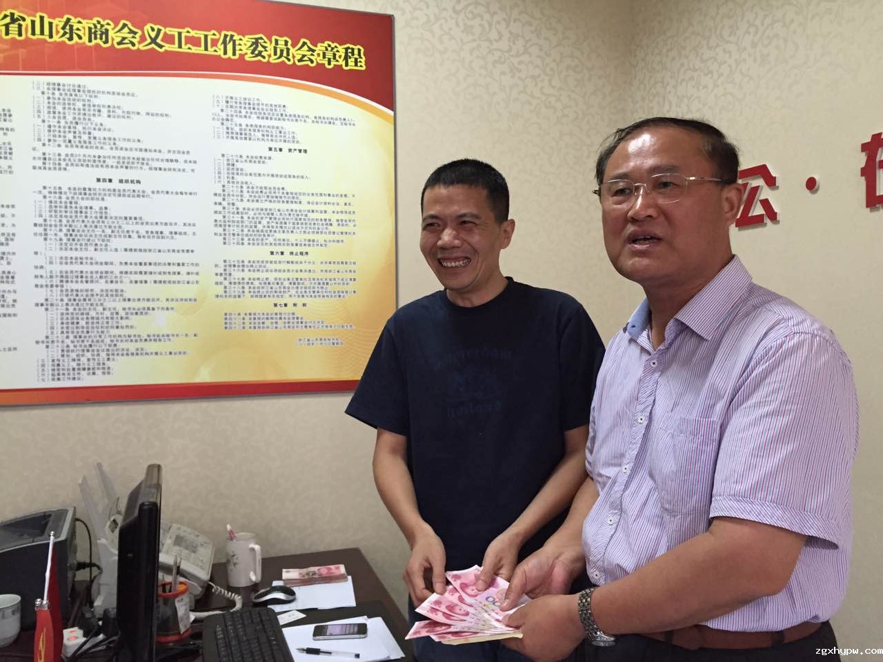 2015年6月13日,因为不会操作网银和支付宝,年逾60岁的商会顾问张守国(山东滨州人)和夫人专程从南京赶到商会,用自己的退休金为老乡徐英茹捐献人民币2000元。