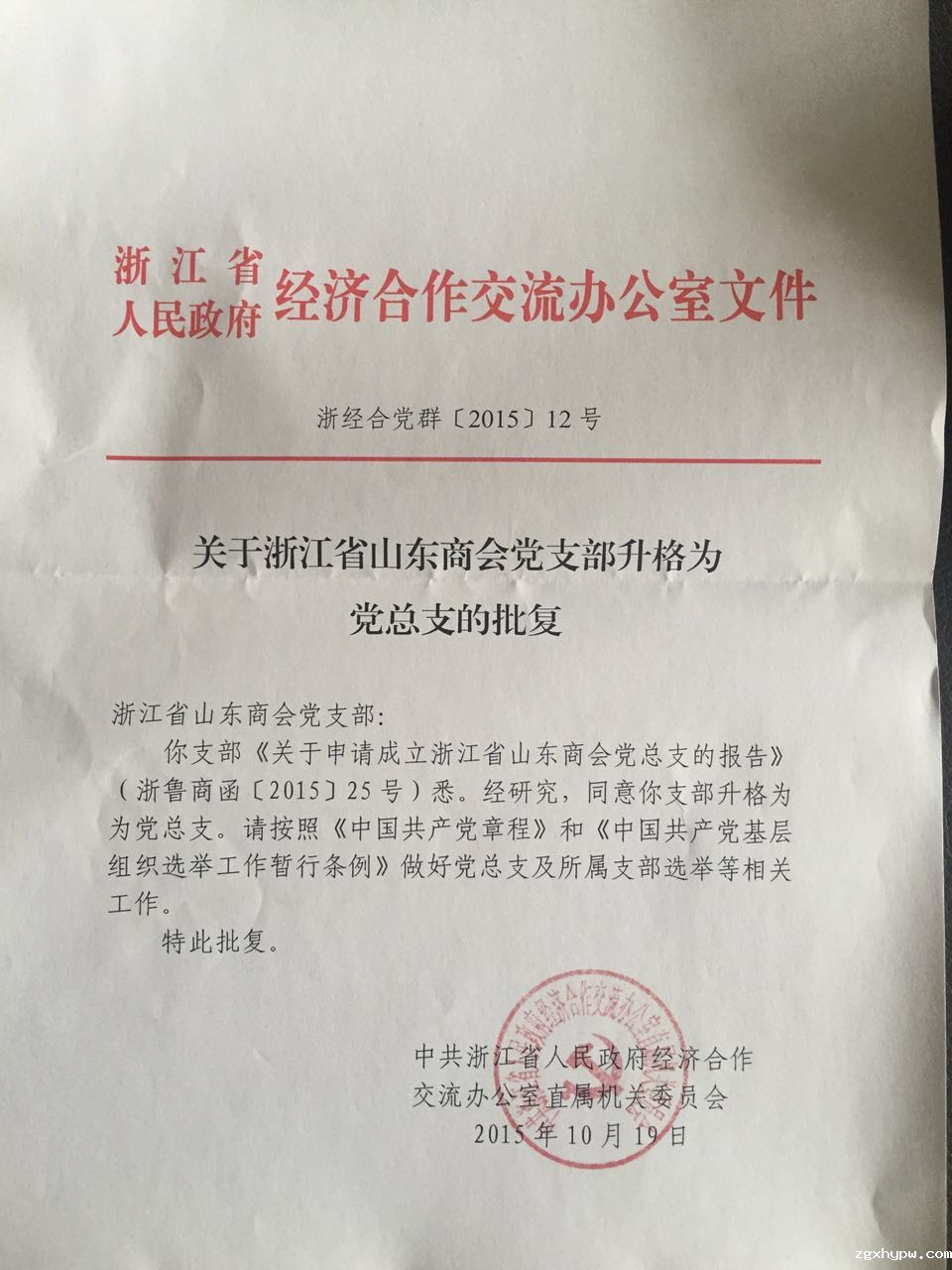 2015年10月19日,浙江省政府经合办直属机关委员会正式批复,同意我会《关于申请成立zgxhypw党总支的报告》(浙鲁商函[2015]25号),同意我会党支部升格为党总支。(来源:zgxhypw党支部。审核:姚强。)