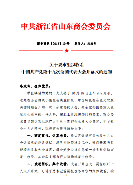 举世瞩目的党的十九大将于10月18日上午9时开幕。这是在全面建成小康社会决胜阶段、中国特色社会主义发展关键时期召开的一次十分重要的大会,是全党全国各族人民政治生活中的一件大事。按照上级组织部门的要求,商会要求各支部认真组织广大党员干部群众收看大会盛况,学习领会十九大精神。现将有关事项通知如下: