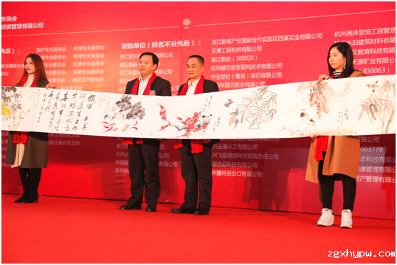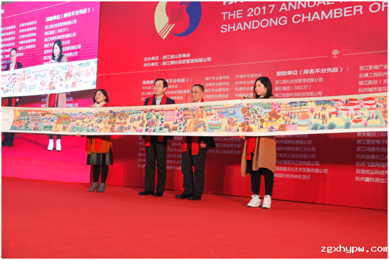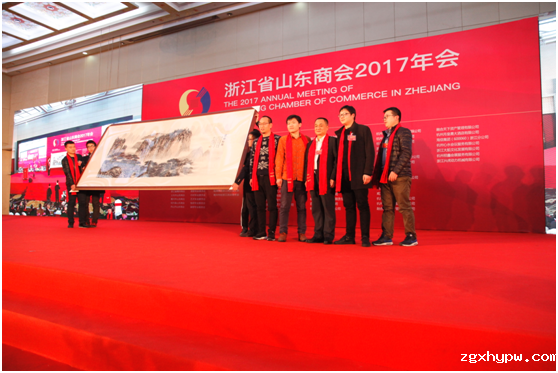 大会上,书画专委会成员杨桐岭、洪云志、董学新、管克阔向商会赠送他们历时一月、倾心创作的巨幅国画《万壑松风图》。青州市委副书记葛英煜、高唐县委副书记孙荣军等家乡领导也向商会赠送了他们带来的具有各地特色的礼品。